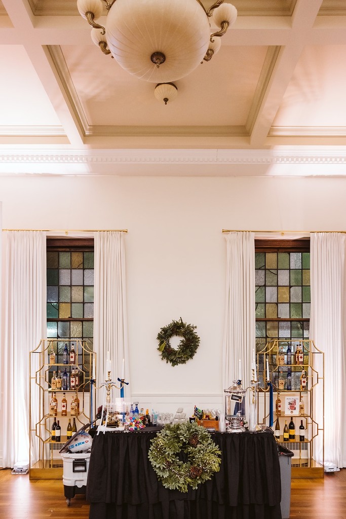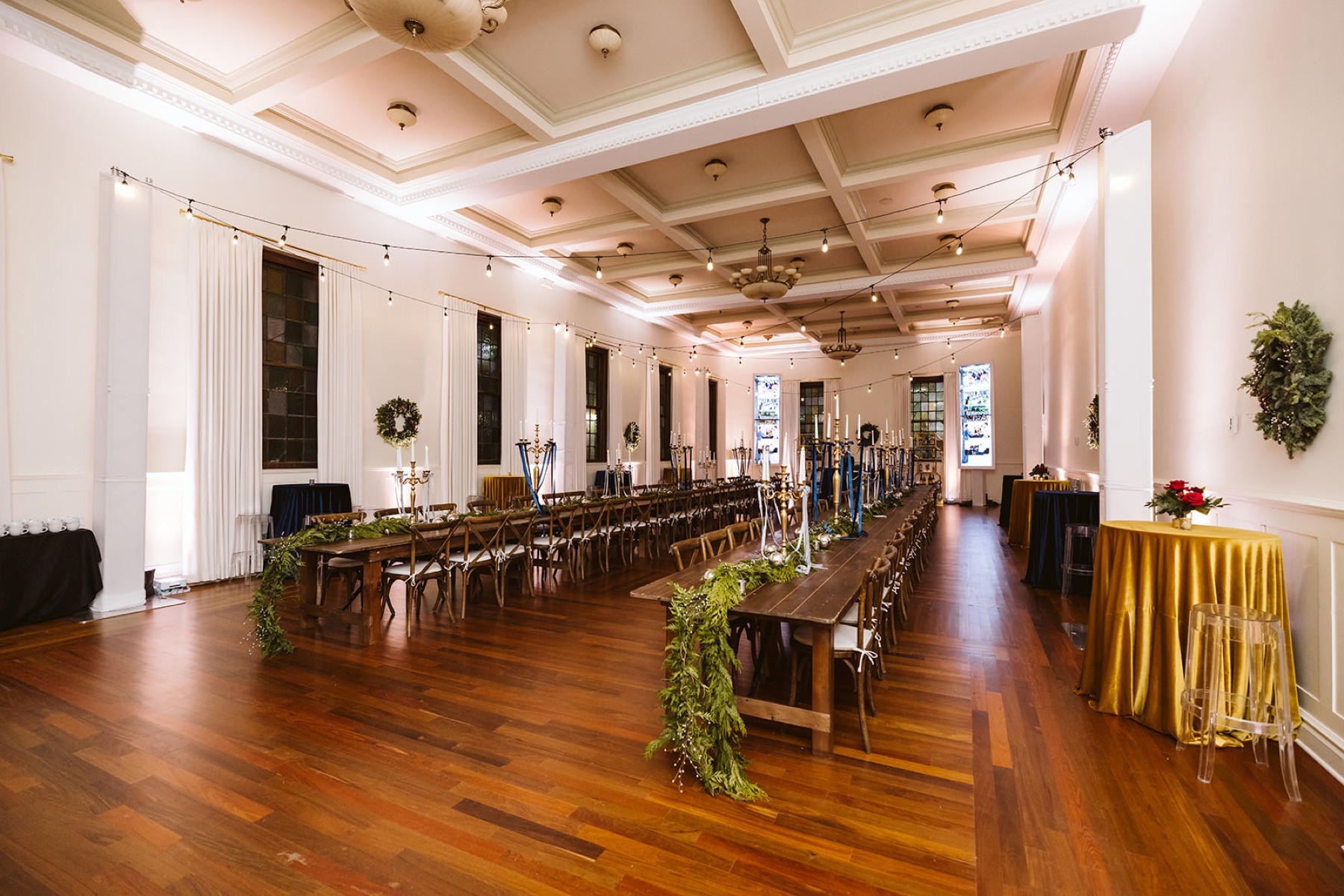 The ballroom’s breathtaking architectural features include original crown molding, three grand chandeliers, and 18 dimmable light fixtures, creating a customizable ambiance. Eight magnificent stained-glass windows add a touch of classic elegance, complemented by custom curtains that can be opened or closed to suit your event’s atmosphere.